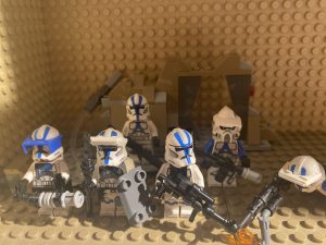 Das Moc zeigt einen Jedi Ritter der gegen 501st Trooper kämpft. Die Figuren habe ich leicht mit Lego Steinen modifiziert, damit sie wie eine Spezialeinheit aussehen. Es sind 7 Figuren verbaut wobei jeder Clon eine spezielle Fähigkeit besitzt.